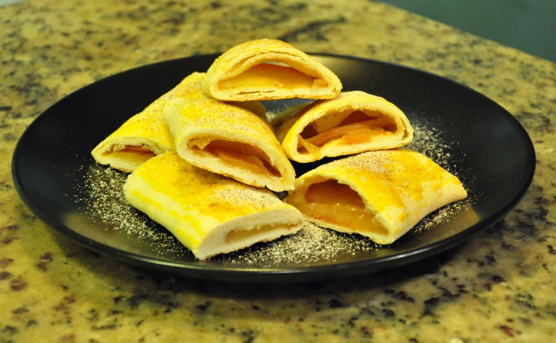 2 – Espalhe os as maças sobre a massa e em seguida enrole com um rocambole. Feixe as extremidades com a ajuda de um garfo e reserve