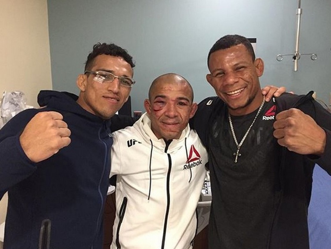 Os três brasileiros que participaram do UFC 218, do último fim de semana, em Detroit, nos Estados Unidos, perderam suas respectivas lutas. Porém, quem saiu mais prejudicado foi o manauara José Aldo. Em uma imagem publicada pelo paulista Charles do Bronx, nas redes sociais, o ex-campeão aparece bem machucado. Quem também está presente na foto é o carioca Alex Cowboy, que foi nocauteado pelo americano Yancy Medeiros.