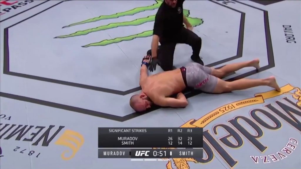 O russo Makhmud Muradov foi o protagonista de um dos nocautes mais impressionantes do UFC Washington do último sábado, nos Estados Unidos. O cara conseguiu um cruzado brutal, que nocauteou o americano Trevor Smith. O detalhe ficou pelo protetor bucal do derrotado, que saiu voando. Confira abaixo: