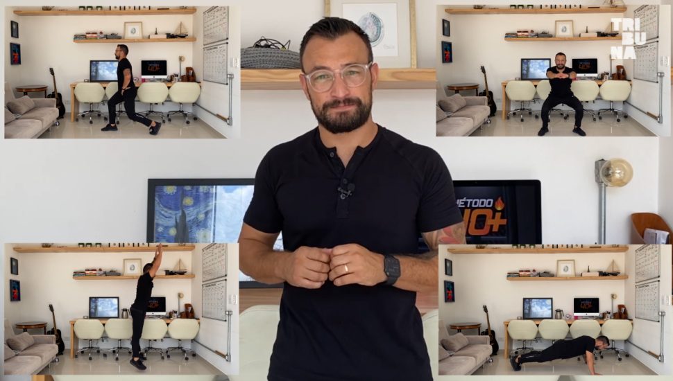 Esses exercícios podem ser feitos em casa mesmo, como por exemplo, polichinelos, joelhos alternados, corrida lateral, polichinelo sapo.