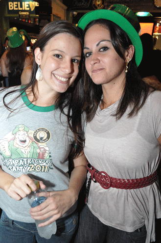 | Rhayara Coelho e Tassielly Lima, que se divertiram ao som da banda “Delorean”, na festa de Saint Patrick que é uma comemoração tradicional no Sheridan’s Irish Pub, em foto de Priscilla Fiedler. |
