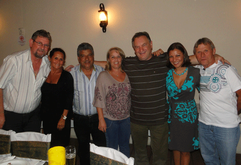 | O casais Joe e Lucia, Antonio Gil e Vera, o aniversariante Ademir Gabardo e Simone, e o véio Manito, na festa de 60 anos do Gabardo na churrascaria Divino Mestre, no flash de Jennifer Lima. |