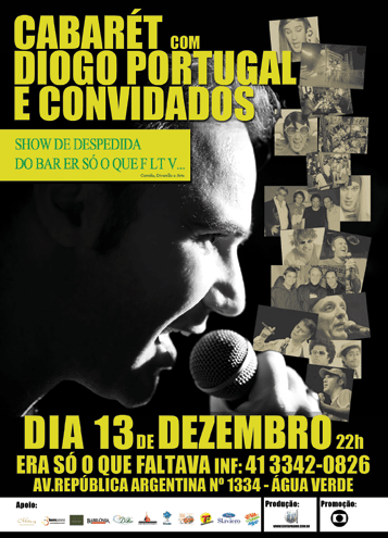 * Diogo Portugal retornará ao palco hoje, a partir das 22h, para apresentar o seu primeiro espetáculo “Cabaré”, quando começou a trabalhar o stand up comedy em Curitiba. Como o bar fechará, pois o prédio será demolido, o humorista fará a apresentação relembrando o início da carreira, há 10 anos, onde trazia convidados de fora da cidade para mesclar com os humoristas locais, promovendo intercâmbio cultural e mistura de modalidades de humor, indo do stand up ao humor musical, passando por esquetes e personagens. Não perca a última apresentação do “Cabaré” com Diogo Portugal e convidados.