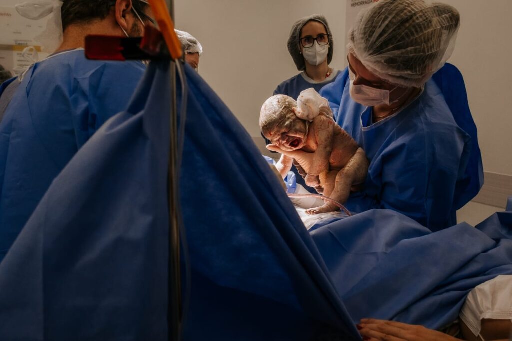 Precisei ser forte para passar tranquilidade quando ela me olhou com uma carinha aflita e disse: “Tô com medo”. Eu sabia que teríamos a melhor assistência possível e tratei de confortá-la, lhe transmitindo a segurança que eu podia dali de onde estávamos, atrás do pano azul erguido entre nós e a pancinha linda da minha esposa. Ficamos surpresos quando a enfermeira disse que seria rápido, coisa de 10 minutos. Achamos graça até, descrentes daquela agilidade toda.