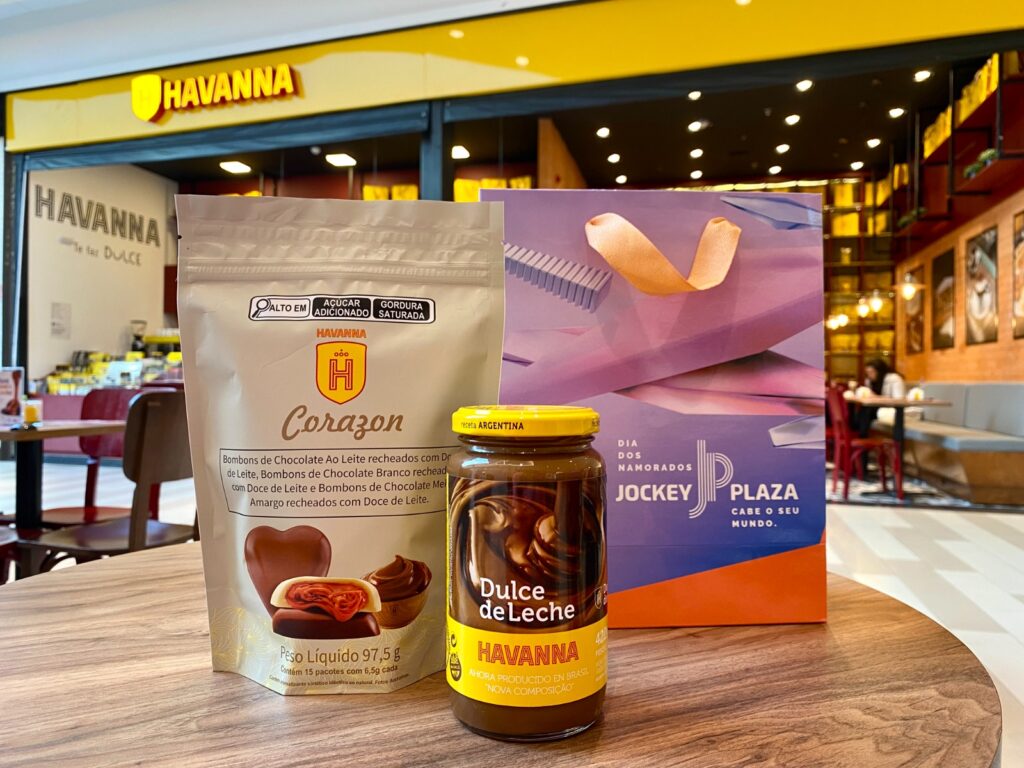 Desde o dia 1º de junho, o shopping Jockey Plaza está com a campanha de Dia dos Namorados “Cabe toda a doçura desse amor”. Com R$ 600 em compras, os clientes poderão trocar suas notas por um kit da tradicional marca argentina de alfajores, cafés e doce de leite Havanna, composto por um pacote de bombons pouch mini corazon misto e um pote do famoso doce de leite Havanna 420g.