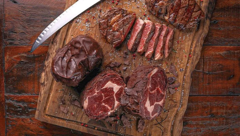 O chef Leandro Aron Fernandes conta que já começou a preparar o corte de bife de ancho em uma técnica que consiste em deixar o corte mergulhado no chocolate de cacau 70% para ganhar um sabor diferente e chamativo durante a cocção na parrilla.