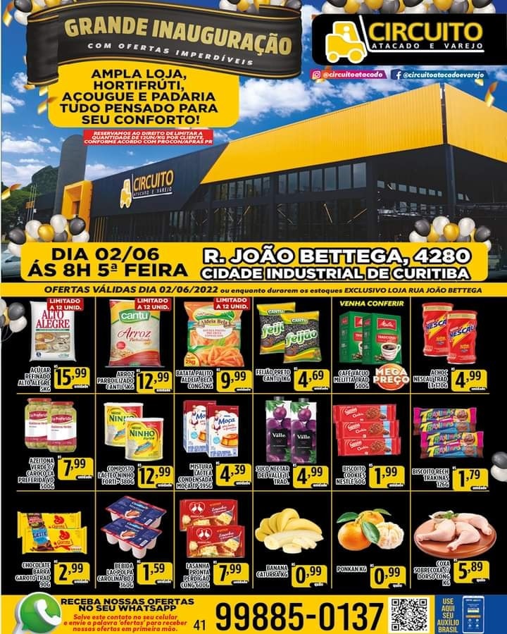 A rede de supermercados paranaense Circuito, que já tem duas lojas na cidade de Colombo, região metropolitana de Curitiba, abre sua primeira filial na capital. A inauguração da unidade que fica na Rua João Bettega foi às 8h desta quinta-feira. Segundo a administração, o local tem cerca de 7 mil metros quadrados e conta com 350 vagas de estacionamento.