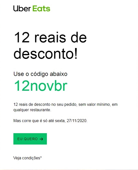 Tá pensando em pedir um almoço ou um lanche? O Uber Eats está com cupom de desconto de R$ 12 reais para esta Black Friday, basta utilizar o código da imagem abaixo. Aproveite! Ah, e tem o festival Compre 1 e Leve 2.