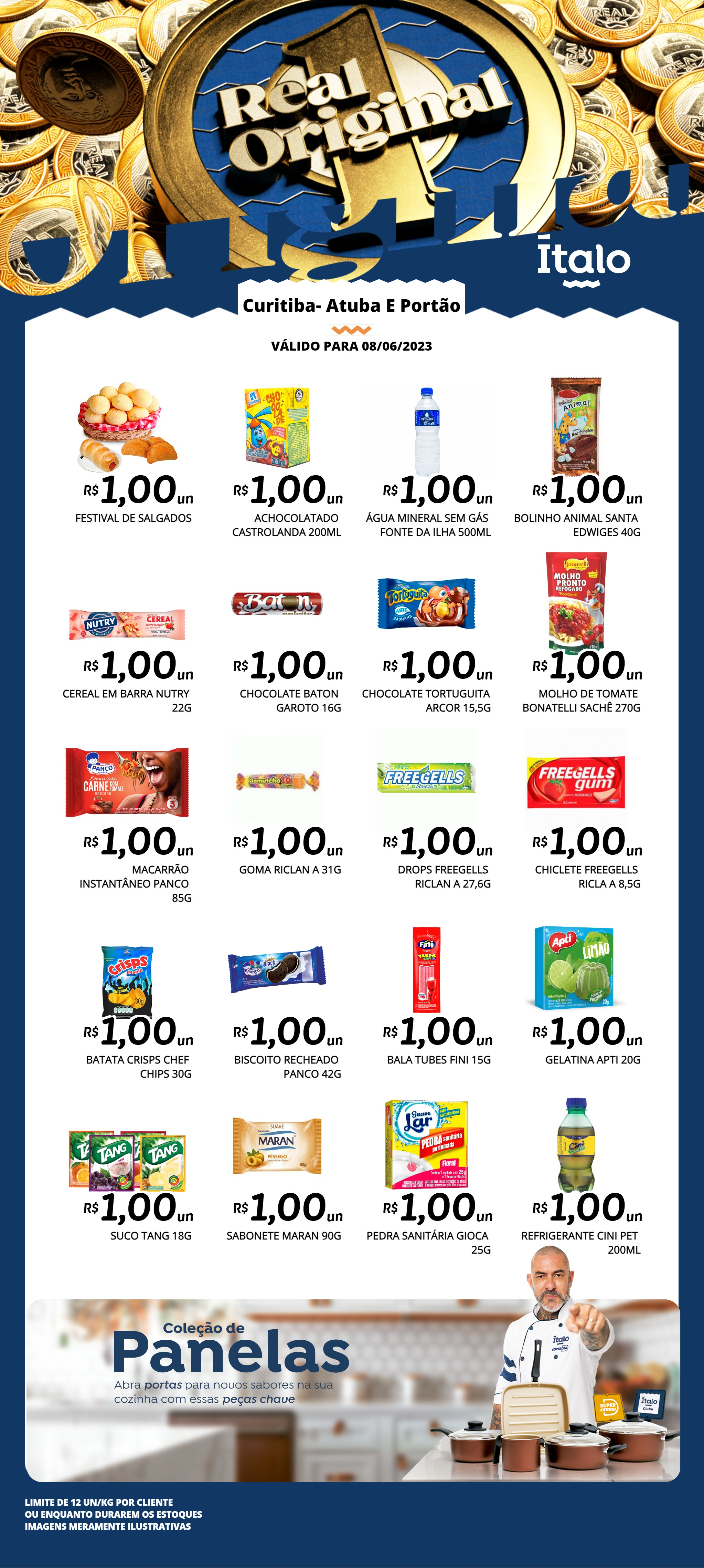 Nesta quinta-feira (08) a os supermercados Ítalo têm a tradição promoção do R$ 1. São dezenas de itens ao preço único de R$ 1. Dá para fazer uma refeição completa, com bebida e sobremesa, por menos de R$ 5.