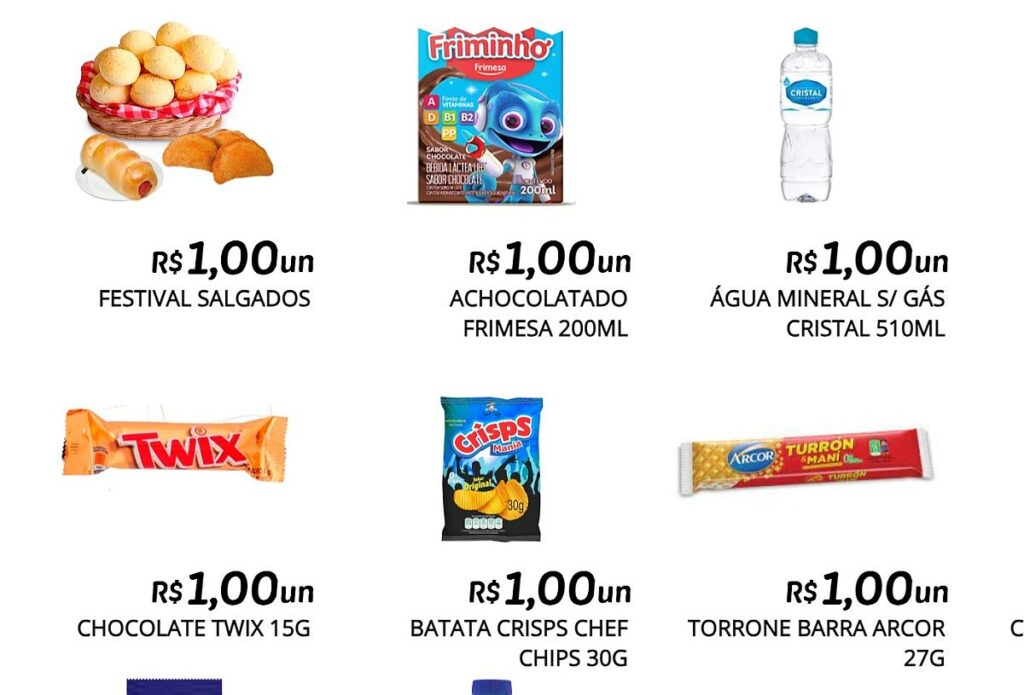 São opções como salgados, água, bolos, chocolates, macarrão, refrigerantes e até café com o preço de R$ 1. Veja os produtos em promoção no encarte a seguir!