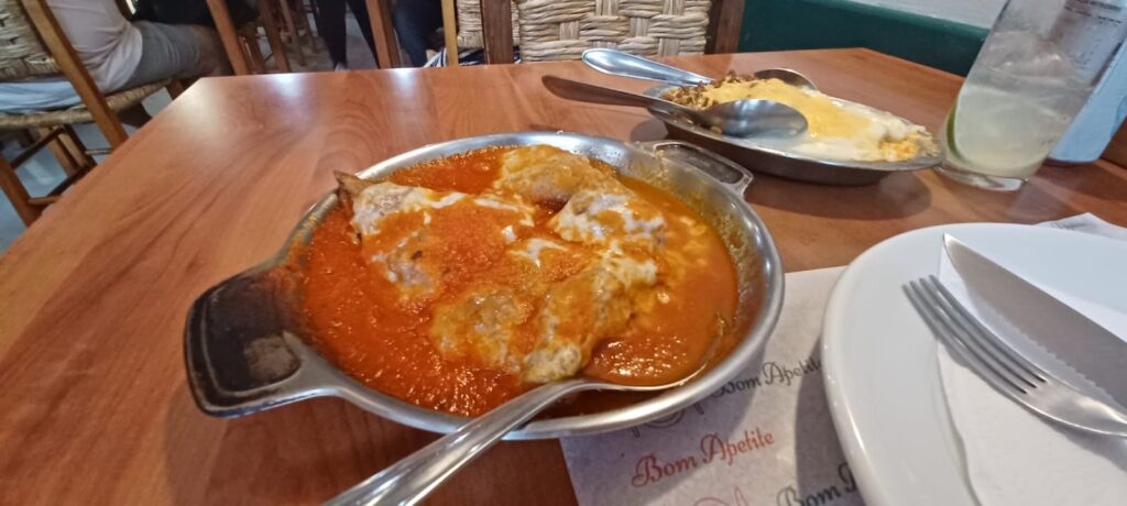 Há também a possibilidade do parmegiana acompanhado de massa fresca, seja ela talharim ou espaguete ao sugo (R$ 33 para uma pessoa ou R$ 64 para duas pessoas, na versão bife, ou R$ 31 para uma pessoa ou R$ 54 para duas pessoas, com frango). Como no Nonna Giovanna todas as massas são frescas, preparadas diariamente de forma bem artesanal, minha escolha foi pela massa. Aceitei a feliz sugestão do garçom e optei pelo espaguete Nonna Giovanna – que é servido metade com molho bolonhesa e outra metade com molho quatro queijos). Há versões de parmegiana com nhoque.