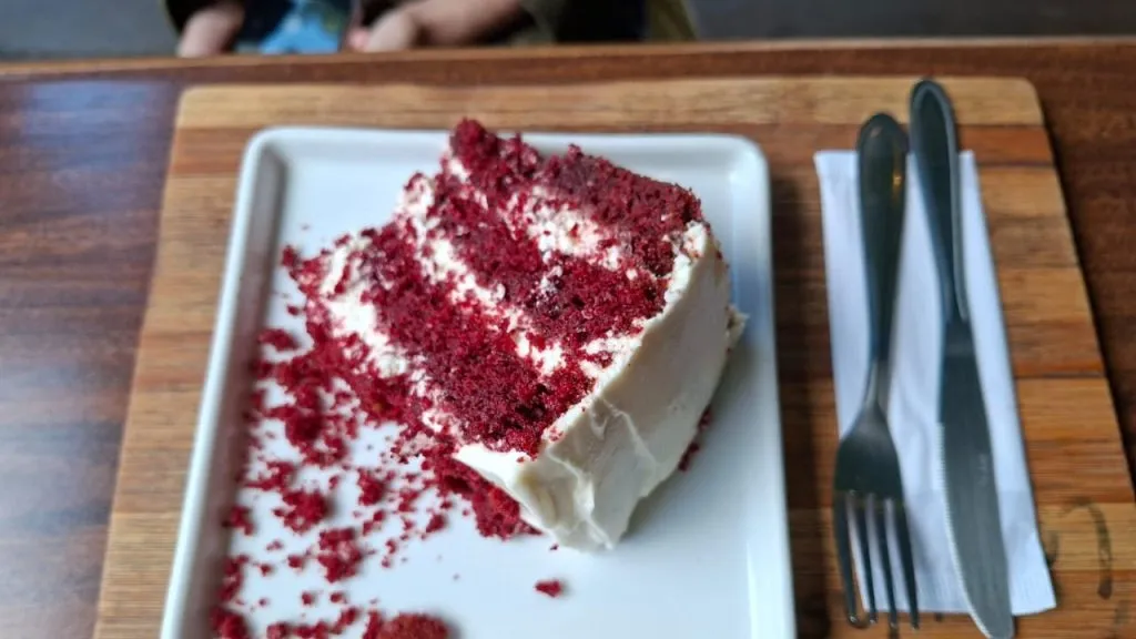 Uma outra opção de sobremesa para o café da tarde é o clássico Red Velvet. O bolo oferecido pelo Leônidas é bem generoso e a fatia compensa por R$ 19. Com massa vermelha e recheio cítrico de limão com cream cheese, a sobremesa é fofinha e com doce equilibrado.