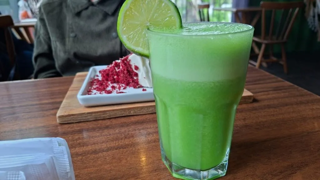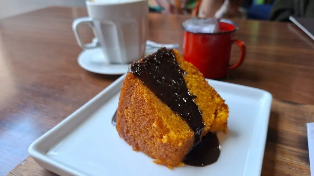 E os bolos? Provei dois deles, que foram uma bela surpresa. O clássico bolo de cenoura com cobertura de chocolate entrega exatamente o que promete: massa fofinha, naturalmente úmida, super perfumado. A cobertura de chocolate é leve e não é açucarada – aquela fatia perfeita para acompanhar o cafezinho. Por R$ 9, achei o valor super justo.
