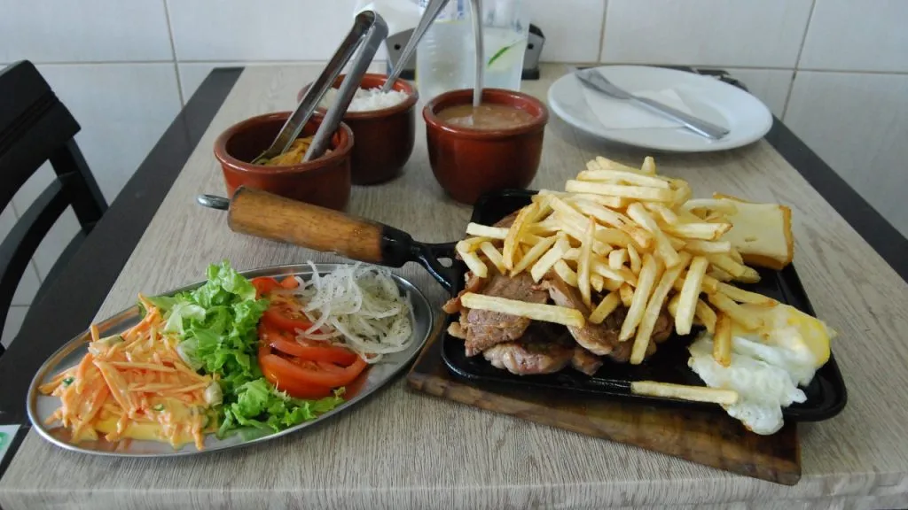 A dica é valiosa! É preciso estar razoavelmente com bastante fome para não ‘apanhar’ da chuleta generosa que chega à mesa. Cheguei perto do meio-dia, numa quinta-feira, e pedi – obviamente – o clássico da casa: chuleta tradicional. O prato é individual, mas serve muito bem duas ou até três pessoas. Vem cerca de 400g de carne numa bela chapa quente que chega fumegando na mesa, mais uma polenta com queijo, uma porção generosa de batata frita e um ovo frito. Fora da chapa, mas em cumbucas, arroz, feijão e macarrão. Também vem uma boa salada, com maionese de cenoura, alface, tomate e cebola cortada bem fininha e temperadinha.