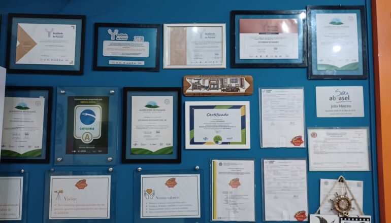 A disciplina e o cuidado com o restaurante foi com o tempo reconhecido. No Jeito Mineiro, perto do caixa, vários selos, indicações, e qualificações conquistadas. Tem selo de categorização A da Anvisa, selo de sustentabilidade, de empreendedorismo do Sebrae, de turismo, muita coisa. “Quero que meu cliente veja e possa chegar e dizer, posso trazer meu filho, meu bebê, minha mãe idosa”, imagina.