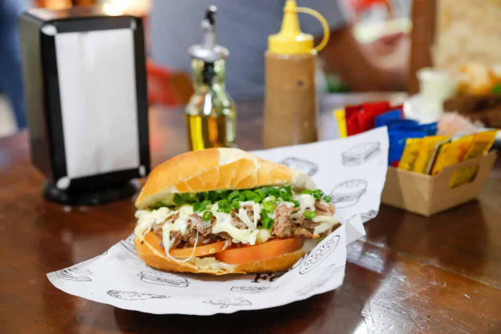 No assado de pernil, o processo é ainda mais longo. A carne suína é temperada um dia antes, fica marinando num tempero por mais de 24 horas. O que vai na marinada? É segredo. “Colocamos ela no outro dia para assar. Aí no lanche, vai com tomate, cebola, queijo, cheiro verde. A carne solta o sabor dela na hora que você dá a refogada na chapa”, detalha João Felipe.