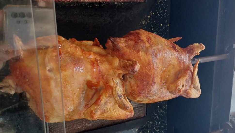 Durante a semana, a venda do frango assado é mais modesta. É no fim de semana que a venda aumenta consideravelmente. Enquanto que durante a semana, são mais ou menos oito frangos assados, no fim de semana a venda atinge quase cem unidades.