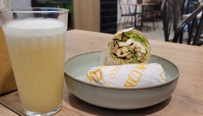 Desta vez, não pedi pelo delivery e fui dar um rolê na lanchonete. Escolhi o sanduíche de sempre: wrap de frango. E não, nada tem a ver com aqueles sanduíches prontos de loja de conveniência de aeroporto. Para começar, o wrap do Natural Food é caseiro: feito artesanalmente e vem até com um restinho de farinha da massa recém assada.