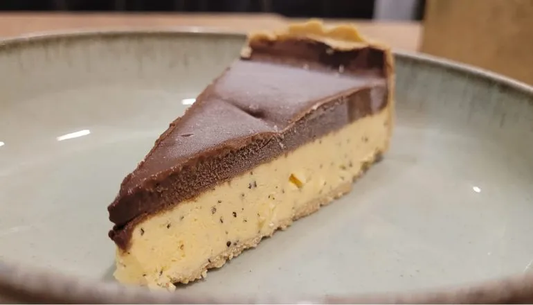 A torta é feita com uma massa fininha de bolacha, e depois recebe um mousse de maracujá e por cima uma espécie de ganache de chocolate meio amargo. É leve, equilibrada, geladinha. A torta chegou na mesa congelada e me fez esperar até que parte dela ficasse maleável para poder cortar com o garfo.