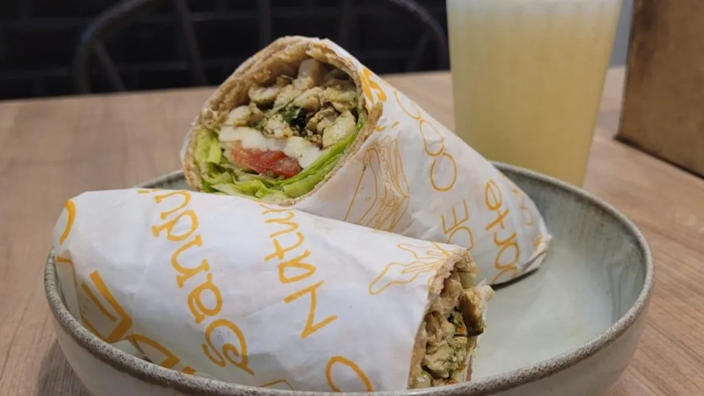 Desta vez, não pedi pelo delivery e fui dar um rolê na lanchonete. Escolhi o sanduíche de sempre: wrap de frango. E não, nada tem a ver com aqueles sanduíches prontos de loja de conveniência de aeroporto. Para começar, o wrap do Natural Food é caseiro: feito artesanalmente e vem até com um restinho de farinha da massa recém assada.