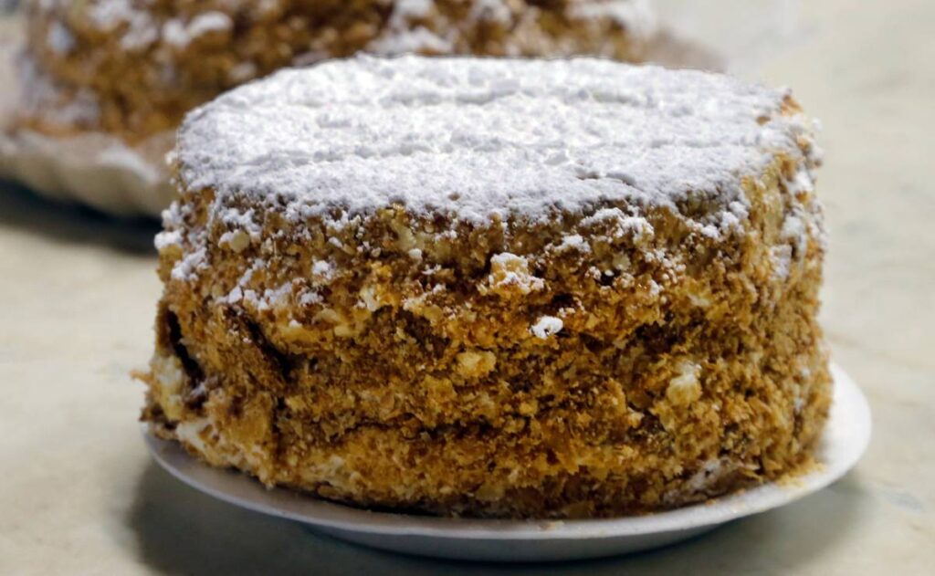 “Para servir no café, a fatia fica muito alta. Então, a maneira que encontramos foi diminuir as camadas. A versão hoje tem seis chapas”, explica o proprietário. Semanalmente, Eduardo produz entre 7 e 10 tortas.