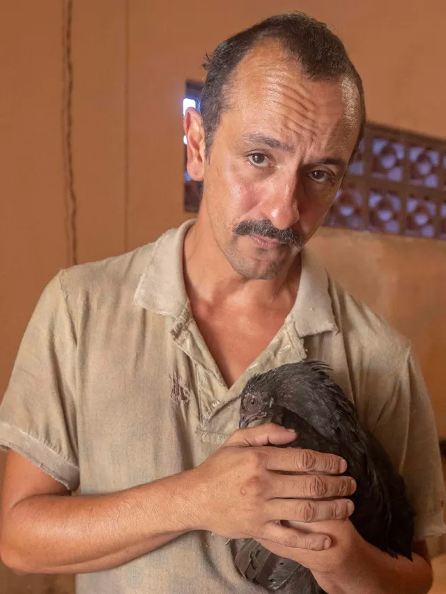 Tião faz uma tipoia para colocar debaixo da camisa e abrigar o ovo