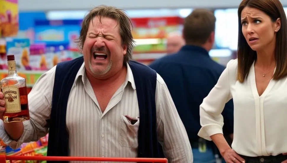 Enquanto ela passava as compras do carrinho para a esteira do caixa, um bêbado, seguinte na fila, a observava. Enquanto o caixa registrava as suas compras, o bêbado calmamente disse: