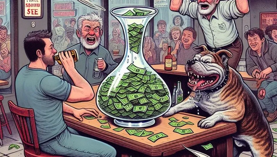 O cara chega num bar e vê um vaso grande, transparente, cheio de dinheiro, no canto. É claro que ele pergunta, super curioso: