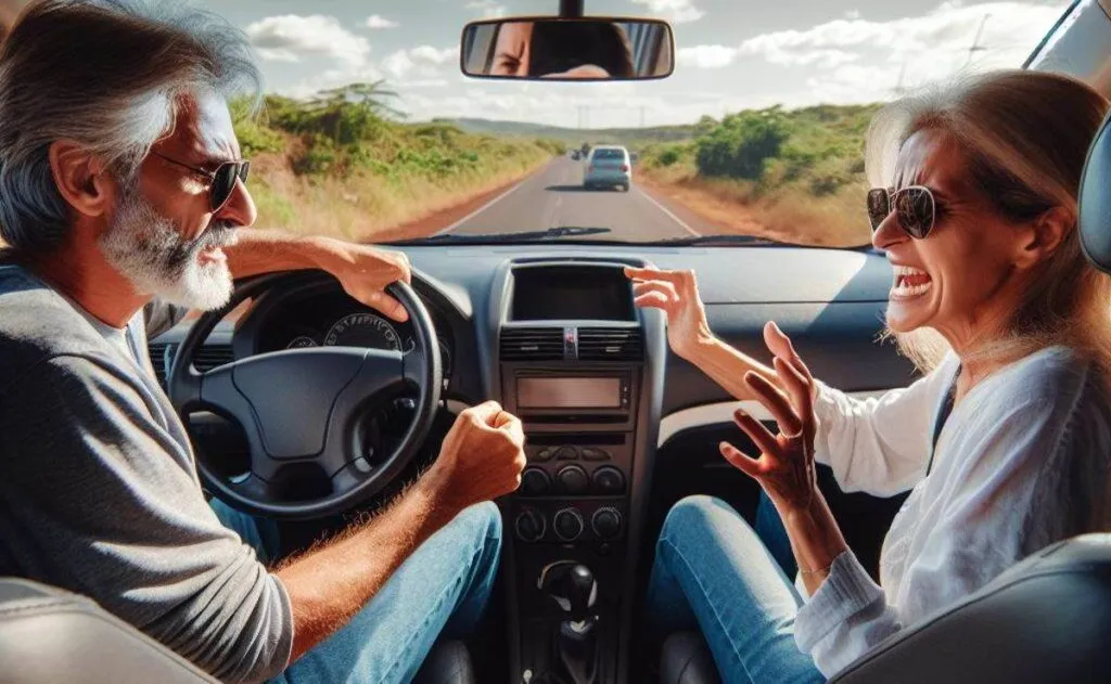 A mulher passando na estrada de carro e o outro carro vindo na direção contrária quando encontra com a mulher, grita: