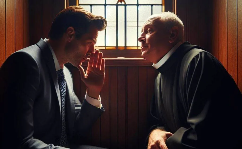 O homem casado entra no confessionário de uma igreja, em Hollywood.