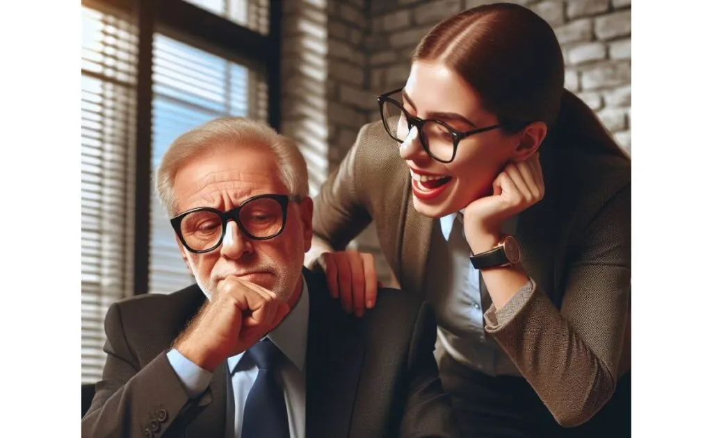 A secretária nota que o chefe está com a braguilha aberta e toda sem jeito tenta lhe dar a notícia: