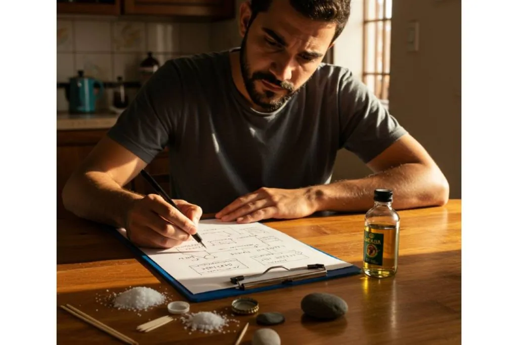 Primeiro vamos precisar de: um pouco de sal; uma tampa de garrafa; um pouco de cachaça; um palito e uma pedrinha.