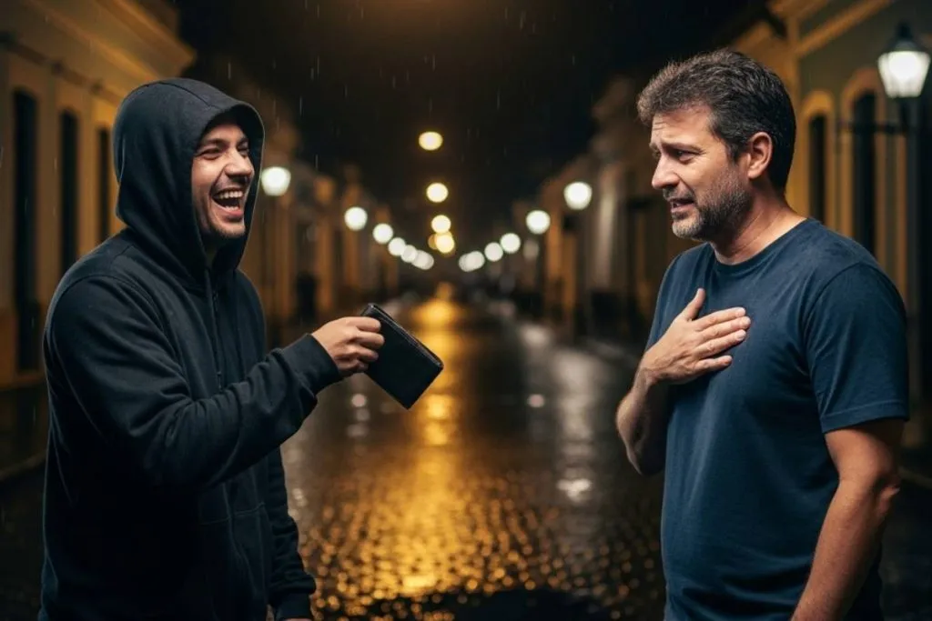 Quando me virei, vi que era um ladrão, pronto pra me assaltar.