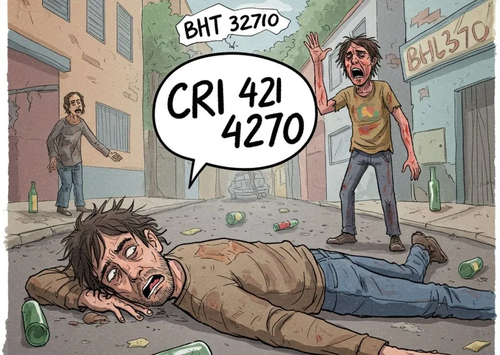 O bêbado que já estava caído e gritando CRI 4270 levanta a cabeça e diz para o outro bêbado: