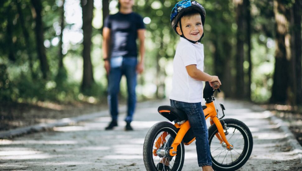 Uma menina ganhou uma bicicleta nova do pai, e andando nela ficou se exibindo para o pai: