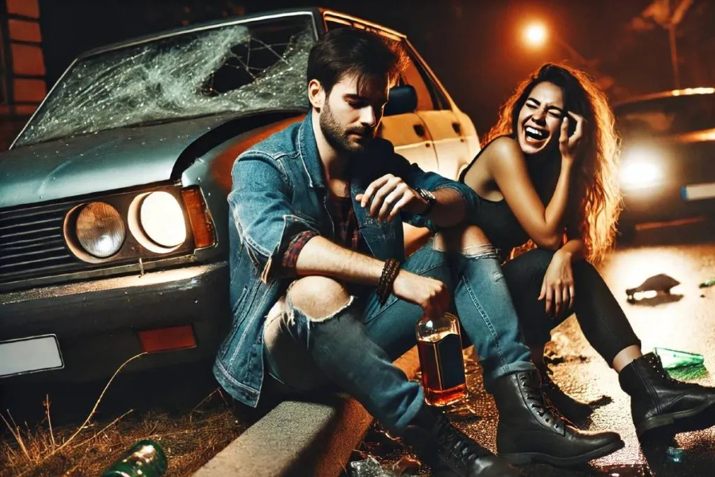 -E olha só, um outro milagre: meu carro ficou totalmente destruído, mas essa garrafa de whisky não quebrou! Deve ser outro sinal. Vamos beber e comemorar esta sorte. E ela entrega a garrafa ao homem. Ele concorda, abre a garrafa e toma alguns goles diretamente do gargalo. E devolve a garrafa a mulher. Ela a pega, coloca a tampa de volta, e a devolve ao homem. Ele não entende o gesto e pergunta: