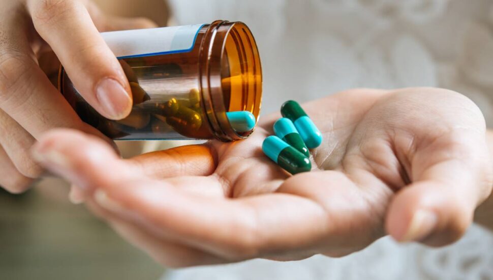Onze horas da noite, o marido entra no quarto com um comprimido e um copo de água na mão.