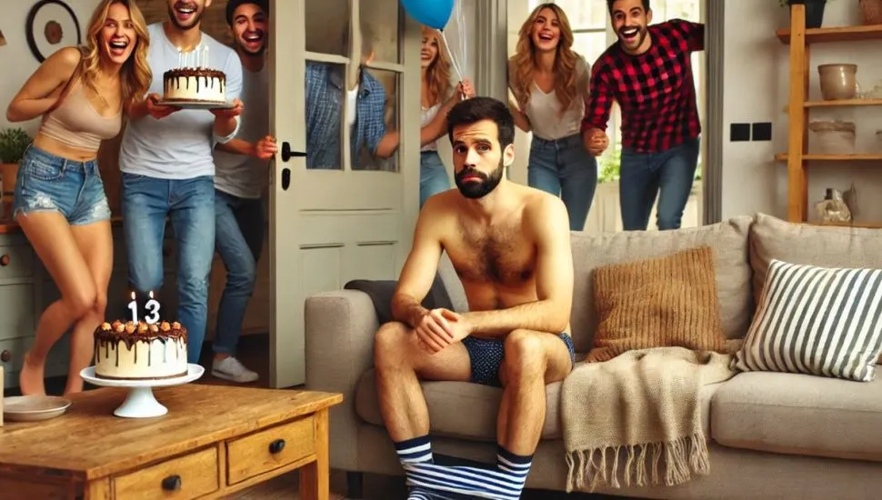 Decorridos mais ou menos 5 minutos, ela saiu do quarto carregando um bolo enorme, seguida por minha mulher e meus filhos, todos cantando: “Parabéns pra você…” E lá estava eu, nu, só de meia, sentado no sofá da sala…
