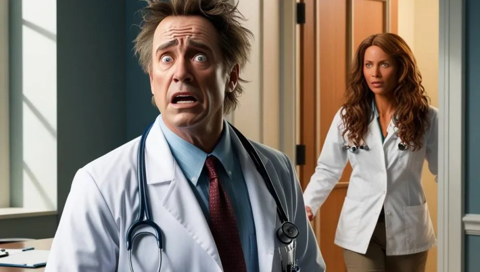 Ele lhe serve um copo, senta-se em sua frente e começam a conversar. De repente ouve-se um barulho de chave na porta do consultório. O médico leva um susto, se levanta e diz: