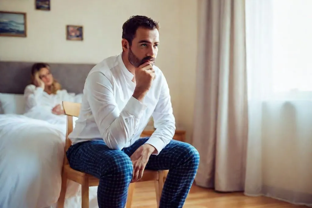 Aí ele vai na cama e beija o pescoço da mulher. Mas de repente ele se levanta e sai do quarto. O marido, falando o mais baixo possível, diz a sua bela mulher:
