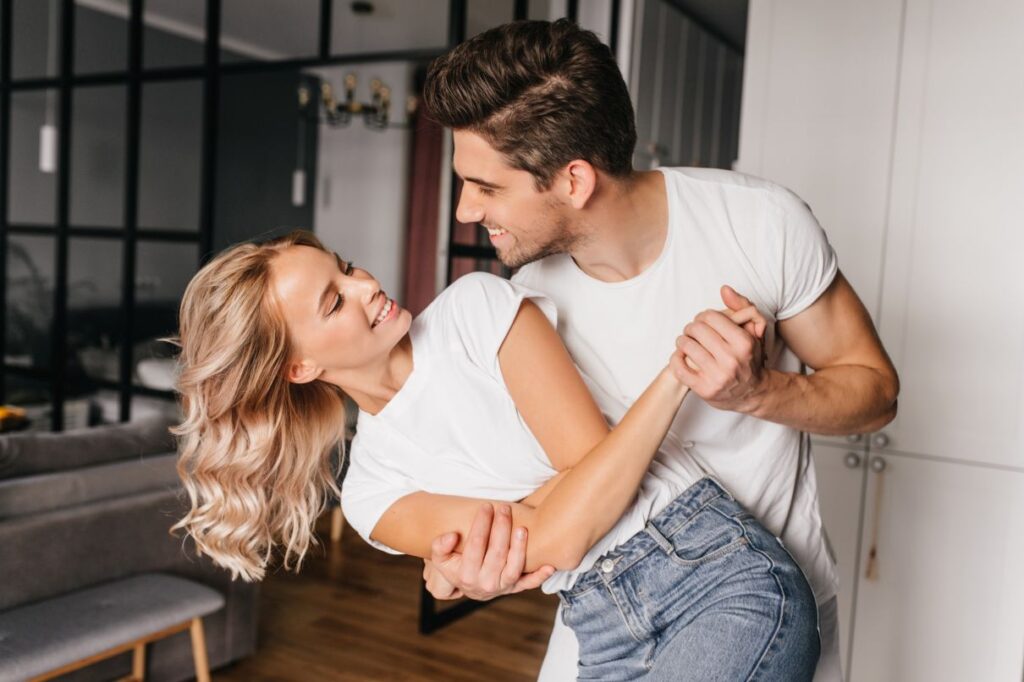 O marido chega da igreja, pega a mulher no colo e começa a dançar pela sala.
