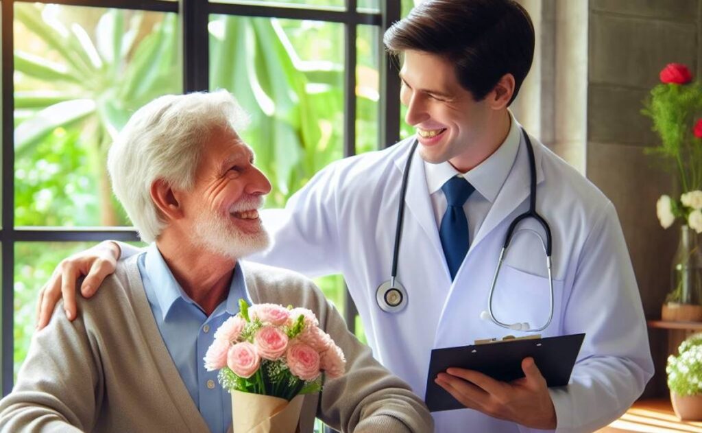 Um jovem médico recebe a visita de seu avô no consultório.
