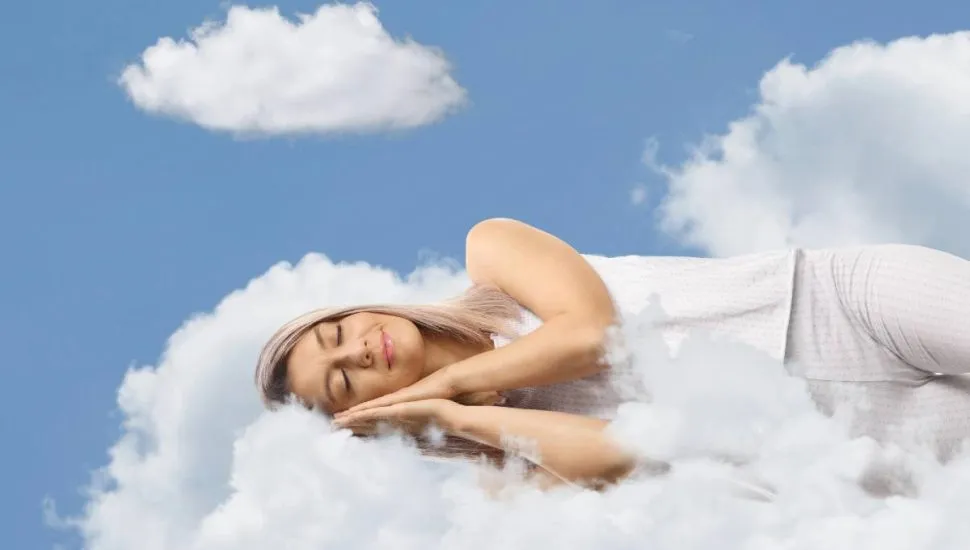 Imagem mostra uma mulher deitada em uma nuvem sonhando