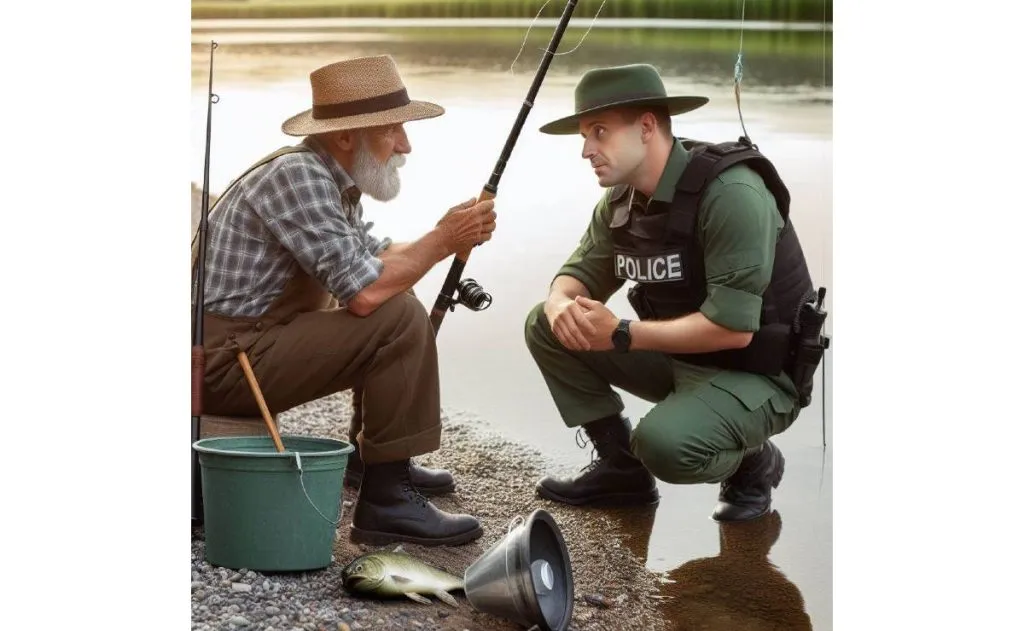 Um pescador estava na beira do rio com o cesto cheio, de repente chegou um policial florestal à paisana e começou a especular: