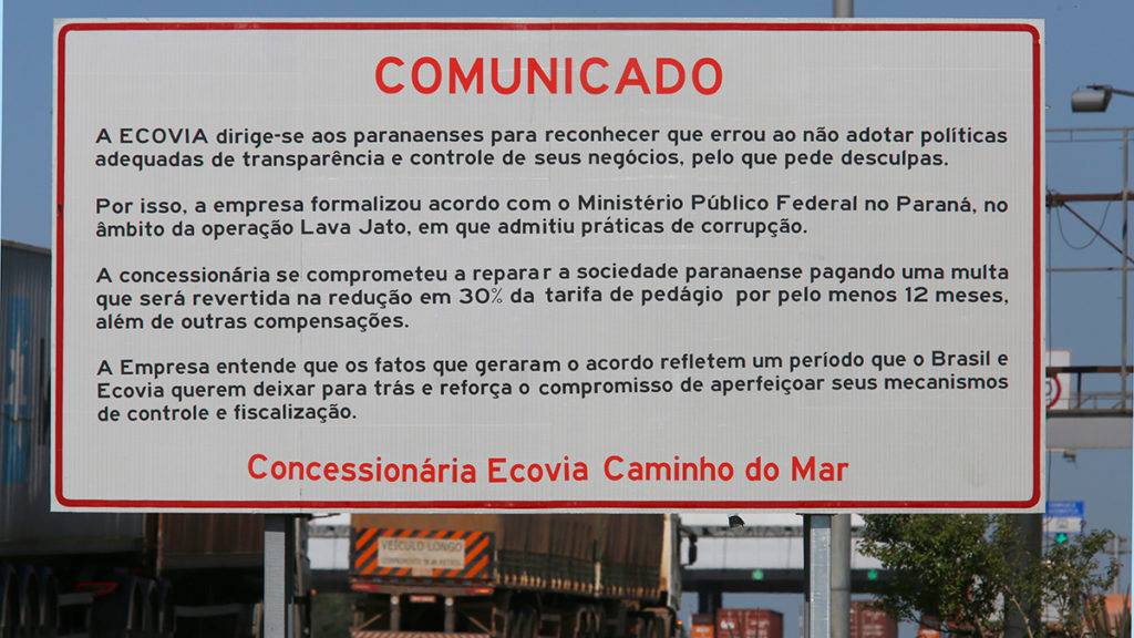 Essa imagem – feita pelo repórter fotográfico Átila Alberti – é uma daquelas que falam mais que mil palavras, mas vou acrescentar mais algumas. Não tinha um paranaense que não achasse os preços cobrados no trecho entre Curitiba e o Litoral do Paraná abusivos. Essa placa foi fixada próximo às cancelas do pedágio ontem e é a admissão pública de culpa pela participação da concessionária em esquemas de corrupção que lesaram você, amigo leitor. A redução do pedágio devolve para o seu bolso (ou deixa de tirar) um pouco do dinheiro que lhe surrupiaram na mão grande. Uma vergonha. (Eduardo Luiz Klisiewicz)