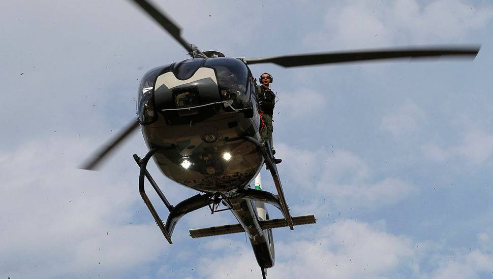 No momento do desespero, da agonia, quando nos encontramos muitas vezes numa encruzilhada entre a vida e a morte, pedimos aos céus por ajuda. Para quem crê, ela vem sempre, para alívio ou conforto. Em concomitantemente a isso, bravos resgatistas da Polícia Militar surgem por entre as nuvens para ajudar na missão de salvar (resgatar) vidas que estão à beira do fim. Um trabalho louvável, ágil e que tem o poder de manter a caneta do destino nas nossas mãos. Na imagem em questão, feita pelo repórter fotográfico Átila Alberti, um motoqueiro vítima de um acidente foi levado com vida ao Hospital do Rocio, em Campo Largo. (Eduardo Luiz Klisiewicz)
