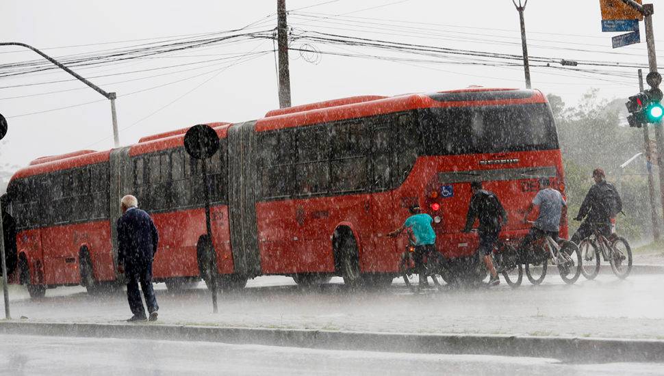 Este senhor não conseguiu se abrigar a tempo e foi pego de surpresa pela pancada de chuva, que caiu em Curitiba. Enquanto a turma de jovens se divertia de maneira até perigosa, pegando “rabeta” no ônibus, o senhor olhava como que procurando um esconderijo para não ficar todo ensopado. O fotógrafo Átila Alberti não perdeu a oportunidade e mostrou as duas situações. Tanto os jovens se arriscando na chuva, quanto o senhor que não teve reação para escapar do aguaceiro.