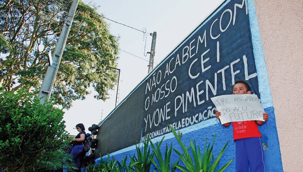 O B.O. da mudança proposta pela Prefeitura de Curitiba no repasse de verbas para os Centro de Educação Infantil (CEIs – Creches) – que prevê entre outras coisas o fim do pagamento complementar das famílias pelo serviço, cessa repasse de dinheiro nos meses de férias e não permite aos pais escolher em qual creche os filhos ficarão – ainda não acabou. Mas uma das imagens mais impactante desta luta foi feita pelo repórter fotográfico Átila Alberti. Com o pai ao lado (fora do quadro), o menino segura um cartaz que nos rouba palavras e nos faz temer um futuro que está logo ali. (Eduardo Luiz Klisiewicz)
