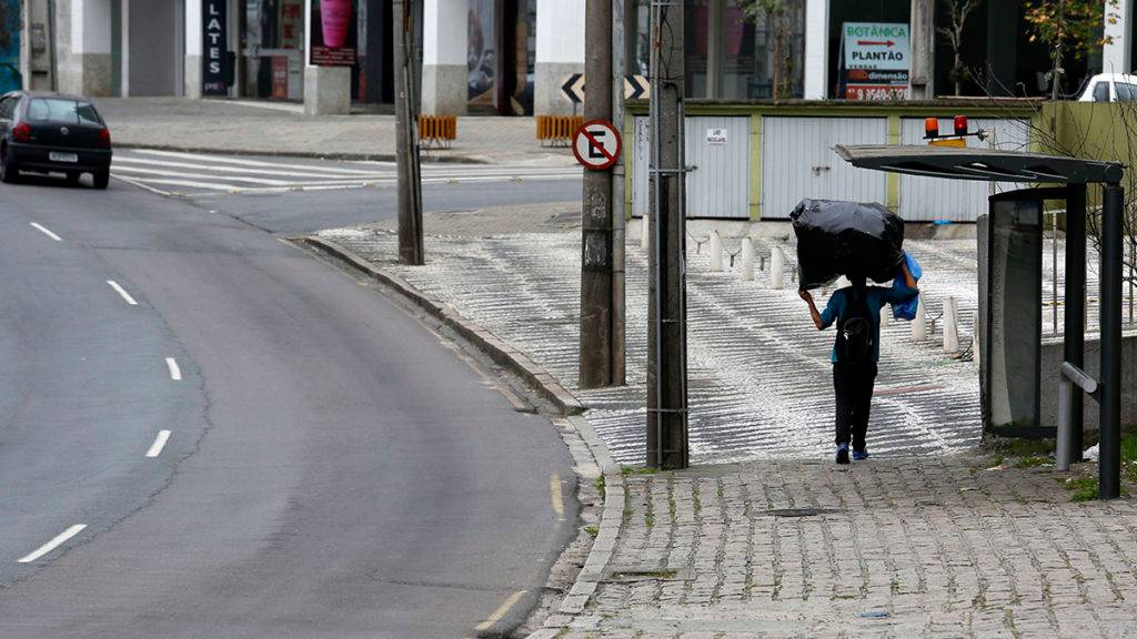 Se as temperaturas estão desabando (pegou a japona pra sair de casa hoje?) e o tempo tá “ficando ruim”, pra esse caboclo aí não tem essa não. Se não tem carrinho, vai no lombo mesmo. A oportunidade (neste caso alguns recicláveis que podem render $$$ pra este lutador) aparece e tem que saber agarrá-la. A vida de quem não tem a carteira assinada é sempre uma luta. Levar o sustento pra mesa dos seus é encarada como desafio pessoal, que no fim do dia vira prato de comida, o troféus dos desempregados. Meus respeitos a eles. A foto é um flagra do repórter fotográfico Átila Alberti. (Eduardo Luiz Klisiewicz)