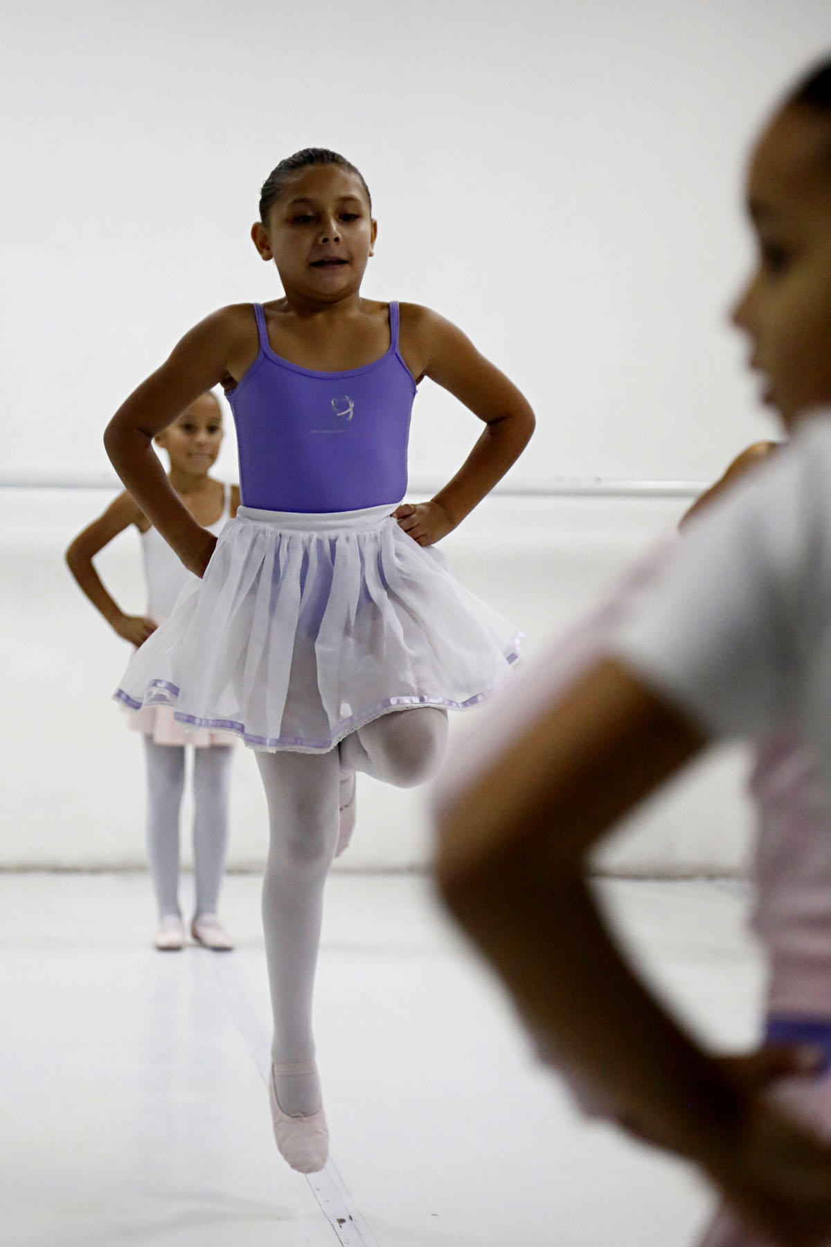 Letícia Nicole de Lima, 7 anos, se apressa em mostrar que sabe fazer uma abertura completa. “Nunca tinha feito aula de balé, mas tinha uma roupa em casa que eu ganhei, e sempre ficava dançando e brincando que era uma bailarina”, diz. Mais tímida, Eloize Gabriele Rodrigues, 7, diz que está achando o balé muito legal, mas acha alguns movimentos um pouquinho difíceis. “O passo que eu mais gosto é o skip”, conta, demonstrando com pulinhos pela sala.